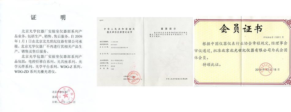 北京光學儀器廠證明文件 報關單位登記證書 中國儀器儀表協會證書