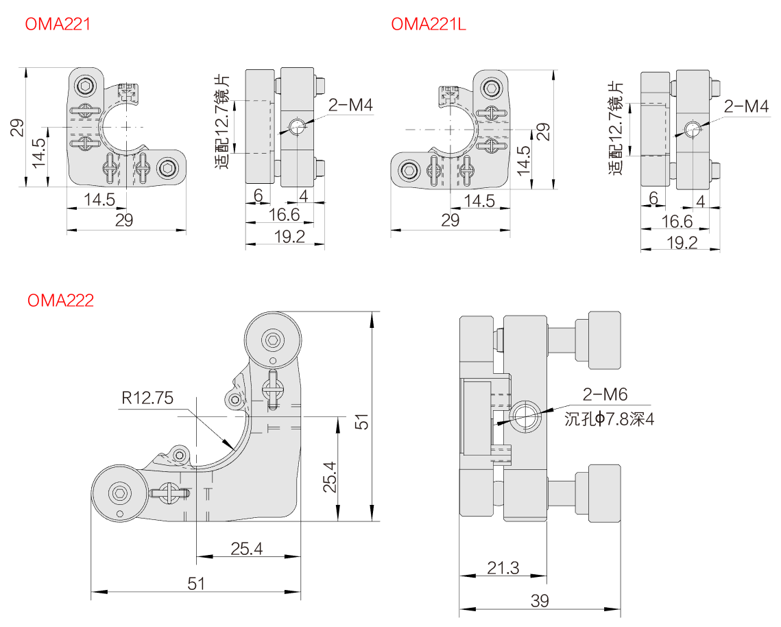 型號 OMA221 OMA221L OMA222 夾持直徑(mm) 12.7 12.7 25.4 通光孔徑(mm) 11.6 11.6 每圈分辨率 0.72° 0.72° 0.39° 固定螺紋 M4 M4 M6或M4沉頭 調整范圍 ±3o ±3o ±3o 夾持厚度(mm) 2-6 2-6 max6.5