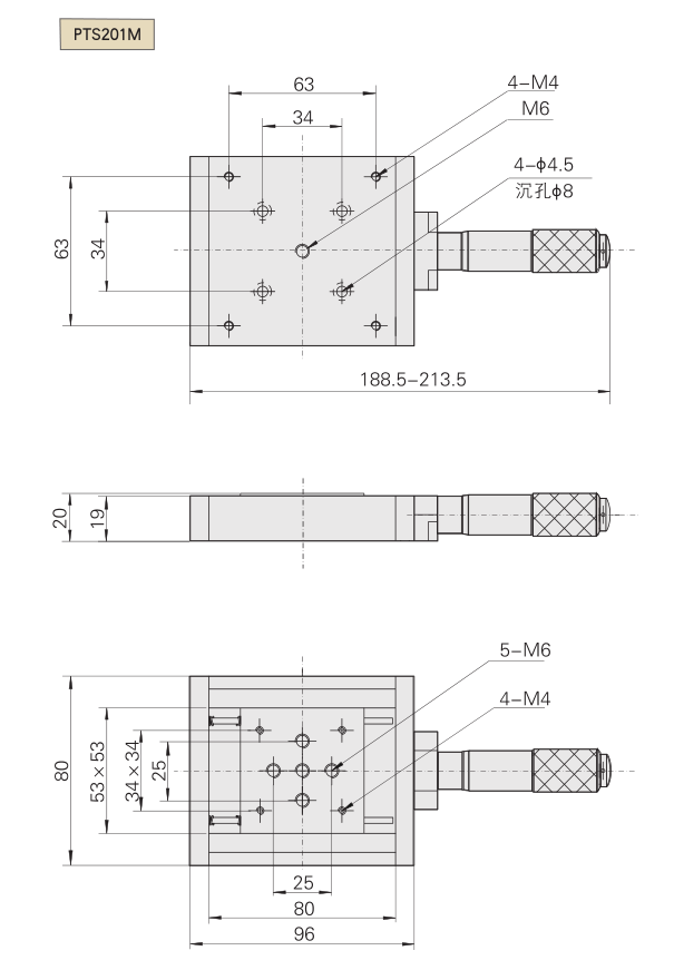 V 形導軌+線性滾珠 微分頭調整 中心驅動 底面和臺面的標準孔位,便于安裝和組合
