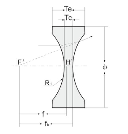 尺寸圖說(shuō)明: Φ- 直徑,R1- 半徑,Tc- 中心厚度,Te- 邊厚,f- 焦距,fb- 背焦